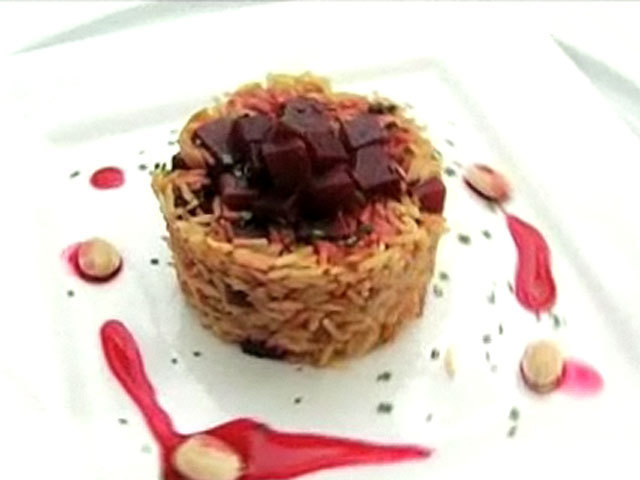 Рецепт вкусного гарнира.Состав:свекла — 70 гр;рис — 1стакан;оливковое масло — 2 столовые ложки;овощной бульон — 2 стакана;миндаль, лук, соль.