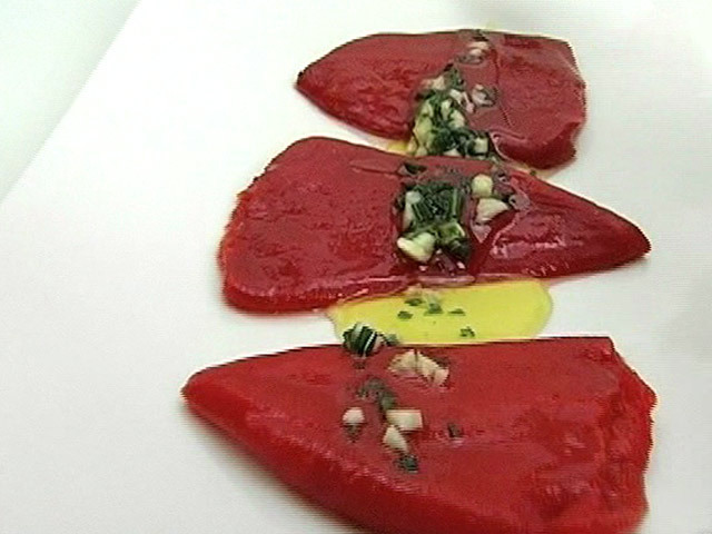 Угостите гостей пресервами из жареных красных перцев.Состав:красный перец — 3 штуки;вода — 1/2 стакана;зеленый лук — 1 столовая ложка;чеснок — 1 столовая ложка;сахар, соль, оливковое масло — по вкусу.
