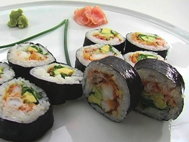 Толстые роллы «Футо-маки».Состав:креветки — 3 штуки;авокадо — 1 штука;огурец — 1 штука;салат — 30 гр;нори — 1 лист;зеленый лук — 1 стручок;яйцо — 1 штука;тесто гиоза — 5 листочков;рис — 60 гр;оливковое масло.